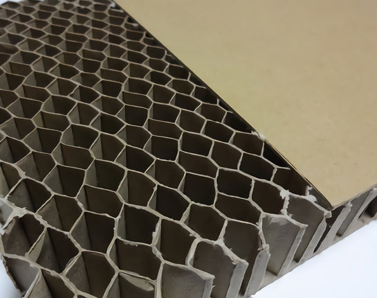 ハニカムダンボールに用いられるハニカム構造体とは、1949年アメリカの軍用飛行機の構造として採用され、軽さと強さの両立を目指して航空産業の中で発達を見せた構造体です。これを “紙” でつくる事でさらに軽く、環境にやさしいハニカムダンボールが誕生しました。構造上、上下方向の圧力に特に強く、厚さ 30mm のハニカムダンボールは 30000kgf/m²の耐荷重強度を持っています。(等分布荷重の条件)