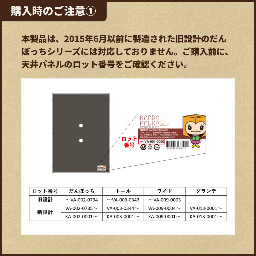 本製品は、2015年6月以前に製造された旧設計のだんぼっちシリーズには対応しておりませんご購入前に天井パネルのロット番号を確認していただきますようお願い申し上げます。