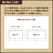 天井パネルのステッカーに記載された「VA-」または「KA-」からはじまる番号をご確認ください。ステッカーを紛失されたなどロット番号が不明な場合は、天井パネルのナット穴の間隔をお調べいただくことにより、確認が可能です。添付資料の寸法(前後面:32㎝、側面:44㎝)であれば、拡張キットに対応しております。