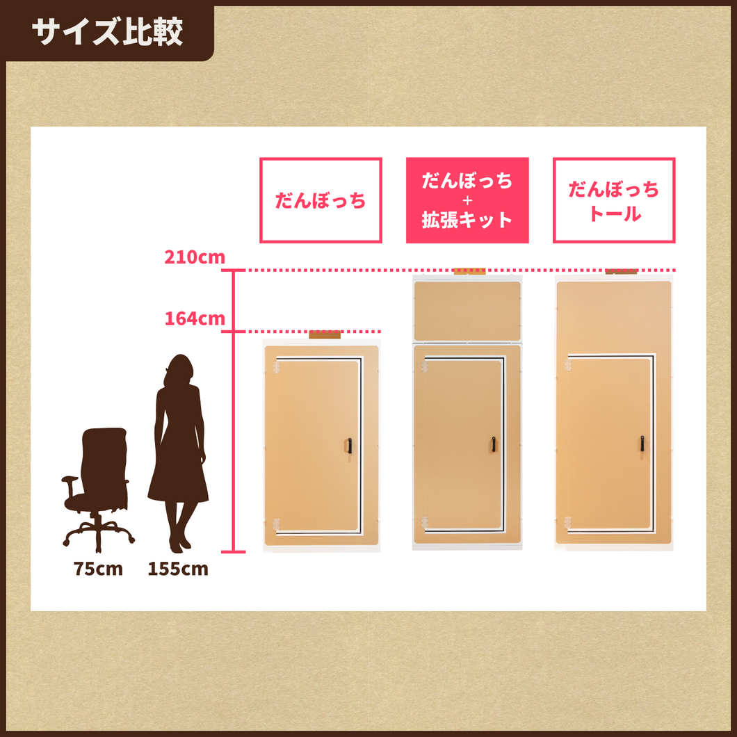 「だんぼっち」の高さを46cm高くすることができる拡張キットです。拡張すると「だんぼっちトール」と同じサイズになります。内寸が高さ192㎝まで広がるため、立った状態で歌いたい、レコーディングをしたい方におすすめ。